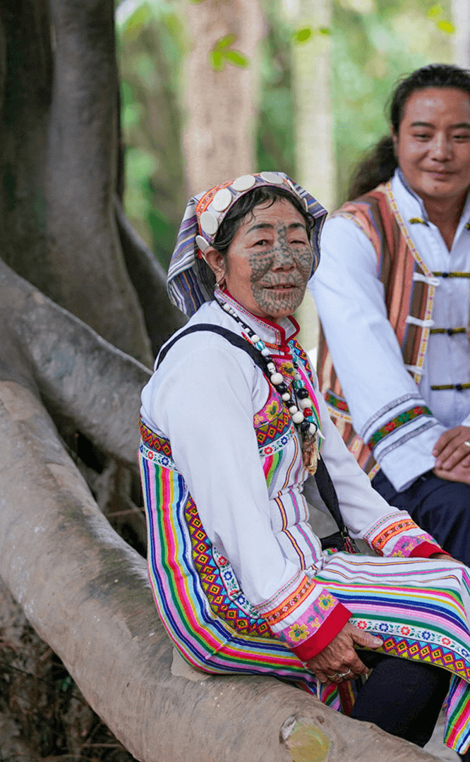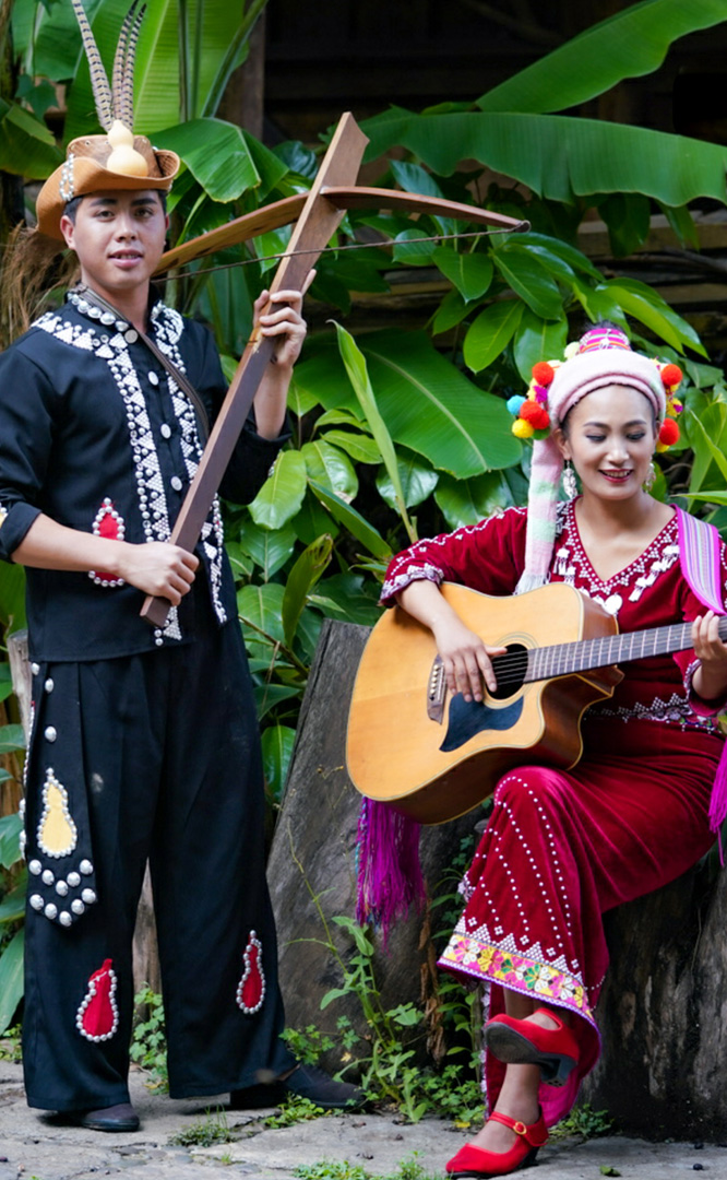 德昂族人口約1.7萬,主要分布在德宏州和保山市的潞西、梁河、瑞麗、隴川、隆陽等縣區(qū)。民居多為草排覆頂竹木結(jié)構(gòu)的干欄式建筑,眼前的德昂村建筑納入了能容納數(shù)十人居住的德昂大房子,氈帽頂?shù)男》孔樱€有頗具浪漫色彩的大公房、小公房……還建有“龍陽塔”標志及佛教奘房、佛塔。德昂族民間普遍信奉南傳佛教,民俗活動與佛事活動關聯(lián)緊密。潑水節(jié)、開門節(jié)、關門節(jié)是重大節(jié)日。德昂族服飾色彩豐富,口頭文學特別是民歌創(chuàng)作活動...